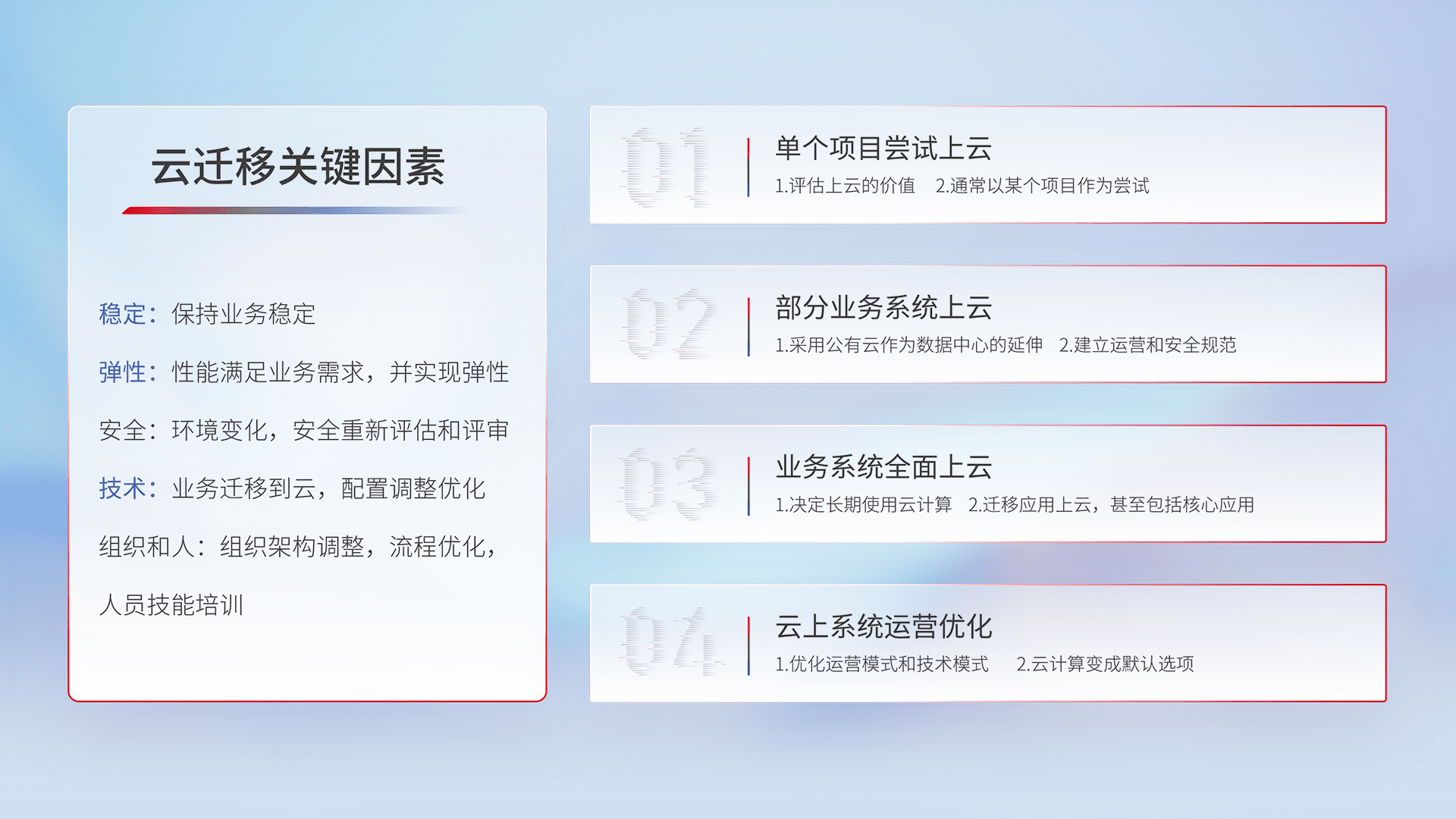 结合实际业务,,,,从规划设计、、、云平台选型、、、、云原生改造、、数据迁移、、、集成交付,,迁移全过程为客户识别最佳上云路径,,,,做好风险识别管理,,,设计网络架构、、身份权限、、安全审计合规、、操作审计、、、日志审计、、监控告警策略、、、多站点容灾设计等,,,对云上基础设施进行整体规划,,,,提升IT治理水平,,以满足弹性、、、高可用、、高性能的需求。。。