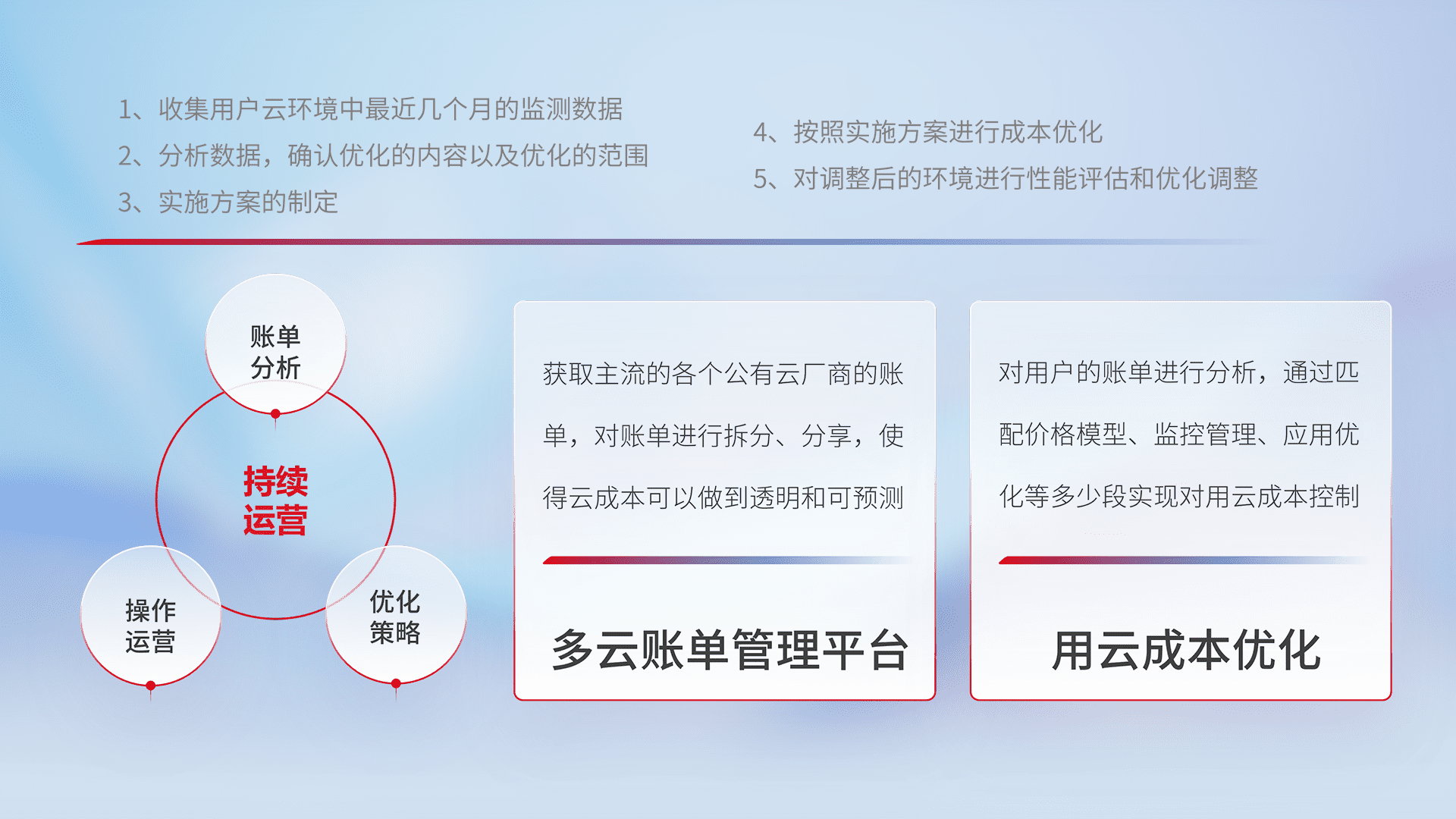 通过多云纳管,,以统一的资源数据模型把客户的云资源进行抽象和封装,,,进而实现对多云资源的统一操作,,保障云资源管理的可靠性、、、、稳定性与可用性。。。。量身定制化运维内容,,,配置、、、开发运维、、补丁管理、、备份、、、、监控、、、认证和访问管理、、、、审计和日常巡检等,,,,保障在用云过程中的可靠度,,,稳定度以及高可用率。。。。